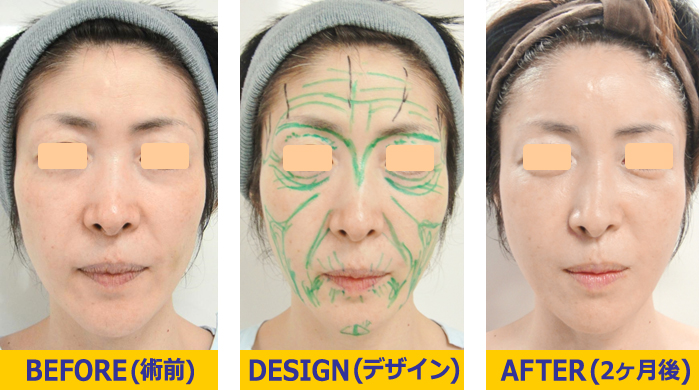 | 当院オリジナルの全顔面フルプレミアム☆フルセット注入技術によって、色・ツヤ・ハリ・肌理の肌質改善はもちろん、シワ・溝・凹み・タルミも一気に改善します。この症例は、40代半ばでまだそれほどの老け感が顔面に表出していないため、劇的な変化は見受けられませんが、個体寿命よりも若い細胞で満たされるため、効果は永続的です。つまり、これからのエイジングを予防する目的もあるのです。 |