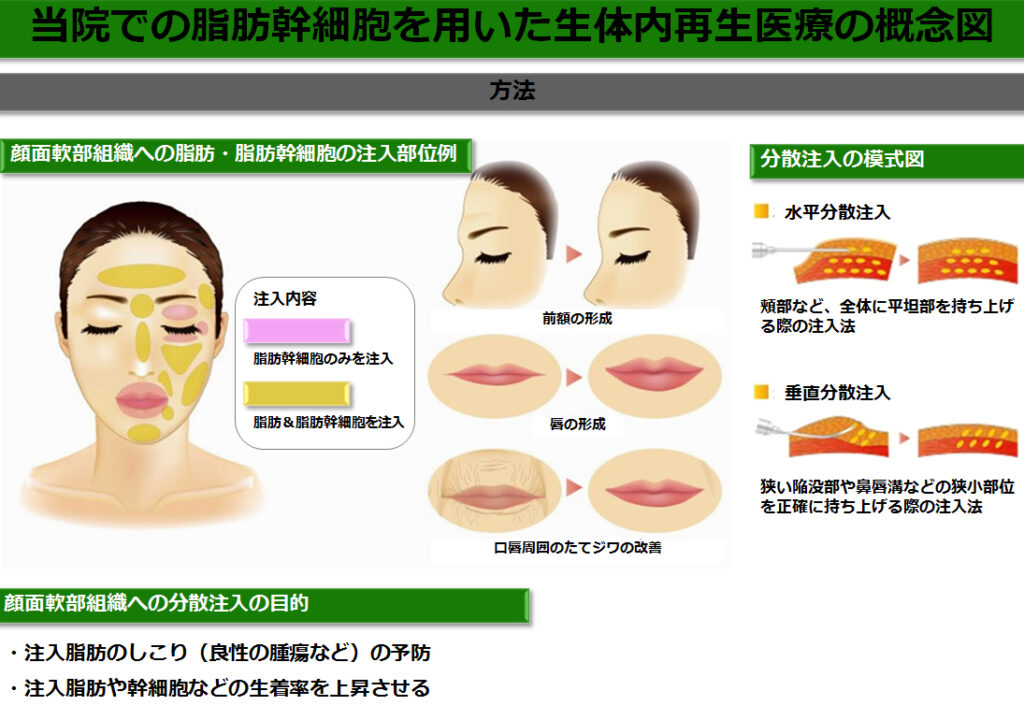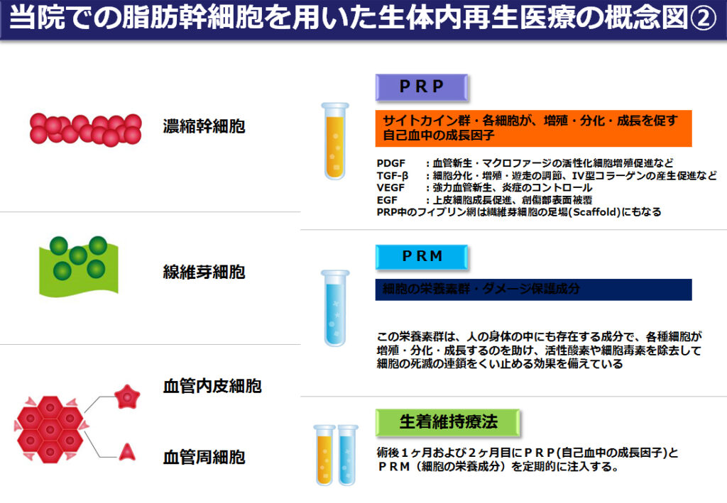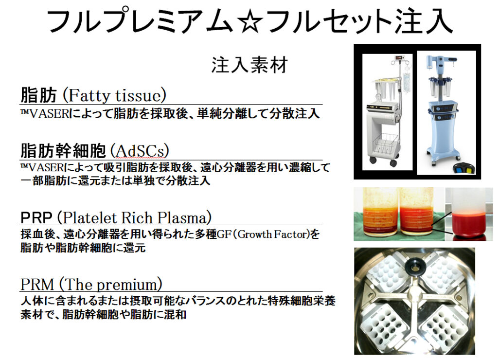 第二に量のみならず脂肪幹細胞・PRP・PRMのみを注入するか、脂肪細胞も加えるかの質の適材適所も考慮した注入を個人・部位に応じて行っています。