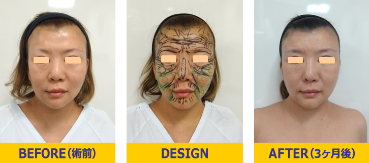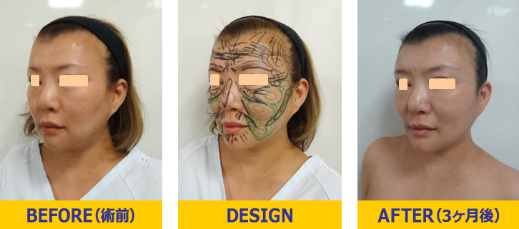 2021年の手術症例です。正面から視認される頬骨付近の左右差がやや著明で、他院で「頬骨削りが必要」と言われた程でした。これ程の左右差があれば、例えば左側頬骨付近の脂肪を右側よりも多く吸引すると左顔面がより下方にタルむか、頬下部との連続性(整合性)がつかなくなってしまいがちです。つまりマニュアル通りの脂肪吸引だと 「こちらをとればあちらが立たず」が生じ得ます。そこで、当院独自のVASER ART 4Dの概念を用いることにより、4Dデザイングラデーションと精密な吸引技術のみで限りなく左右差が改善できました。骨削りをしなくても解消できるかどうかは、直接御本人様の顔面を視診・触診しなければ判別できないため、(写真付メール等ではなく)無料専門外来カウンセリングにて承っております。