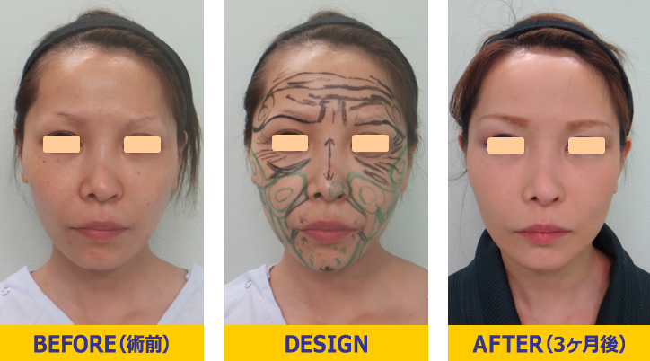 肌質と顔面全体の微妙な左右差に悩まれていた、2017年に手術を受けられた方です。鼻の歪みも顔面Axisに影響していたので、同時手術となりました。顔面の左右差に関しては、勿論骨格や筋肉によるものもありますが、前額・コメカミのシワの形状や陥凹の度合いによって眉の位置や頬へのドロップダウンも一因となります。リスクが高く不自然な仕上がりになる骨削りや切除・人工物の挿入等に頼らずに、如何に皮下組織の増減だけで限りなく左右対称に近づけられるかは、人間の顔面を4Dで捉える特段のデザインと技術を要します。微妙な左右差程、絶妙な匙加減の施術が要求されますね。
