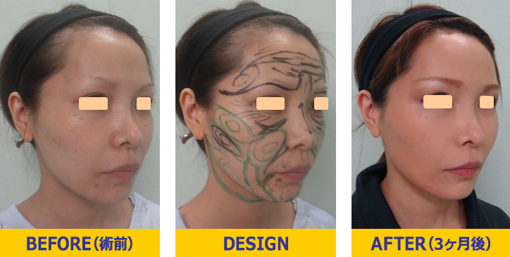 当院が2007年から開発していたもう一つの技術体系が、多数の注入経験から得られた「リフトデザイン注入」という概念です。長年得られた知見から、御本人様の御希望がどの程度なのかを共有しつつ御本人様の顔面でシミュレーションを施し、個別の骨格や筋肉のつき具合、皮下組織の組織組成や左右差、タルミやシワ・陥凹の程度、そして術後の立体+表情を見越した仕上がりを、どの人にも完全オーダーメイドで仕上げることを繰り返して参りました。その技法が更に次の症例にも反映され、常に進化し続けています。