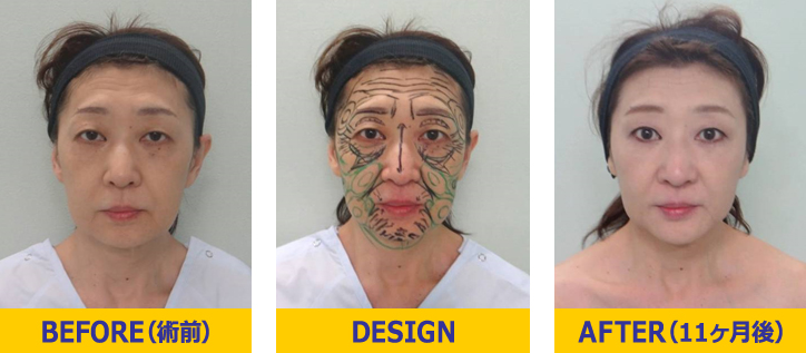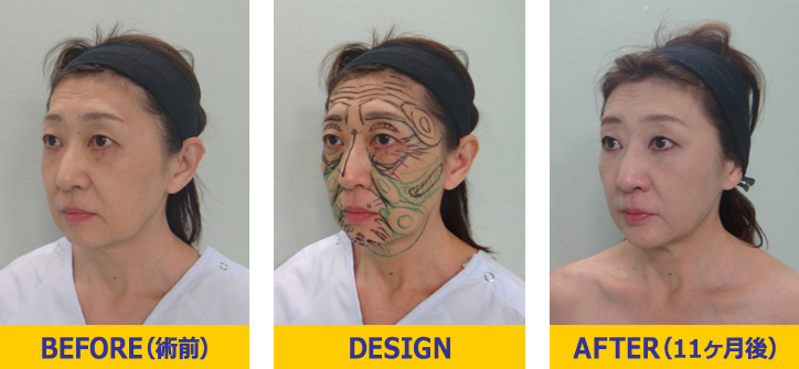 来院当初は当院のリンパ浮腫根治術を希望され、根治手術を行い経過良好であった。経過中当院の(メスを用いない)若返り手術を知る切っ掛けとなり、折角癌から生還したので有意義な第二の人生を送りたいと考えられ本術式(の組合せ)を希望。